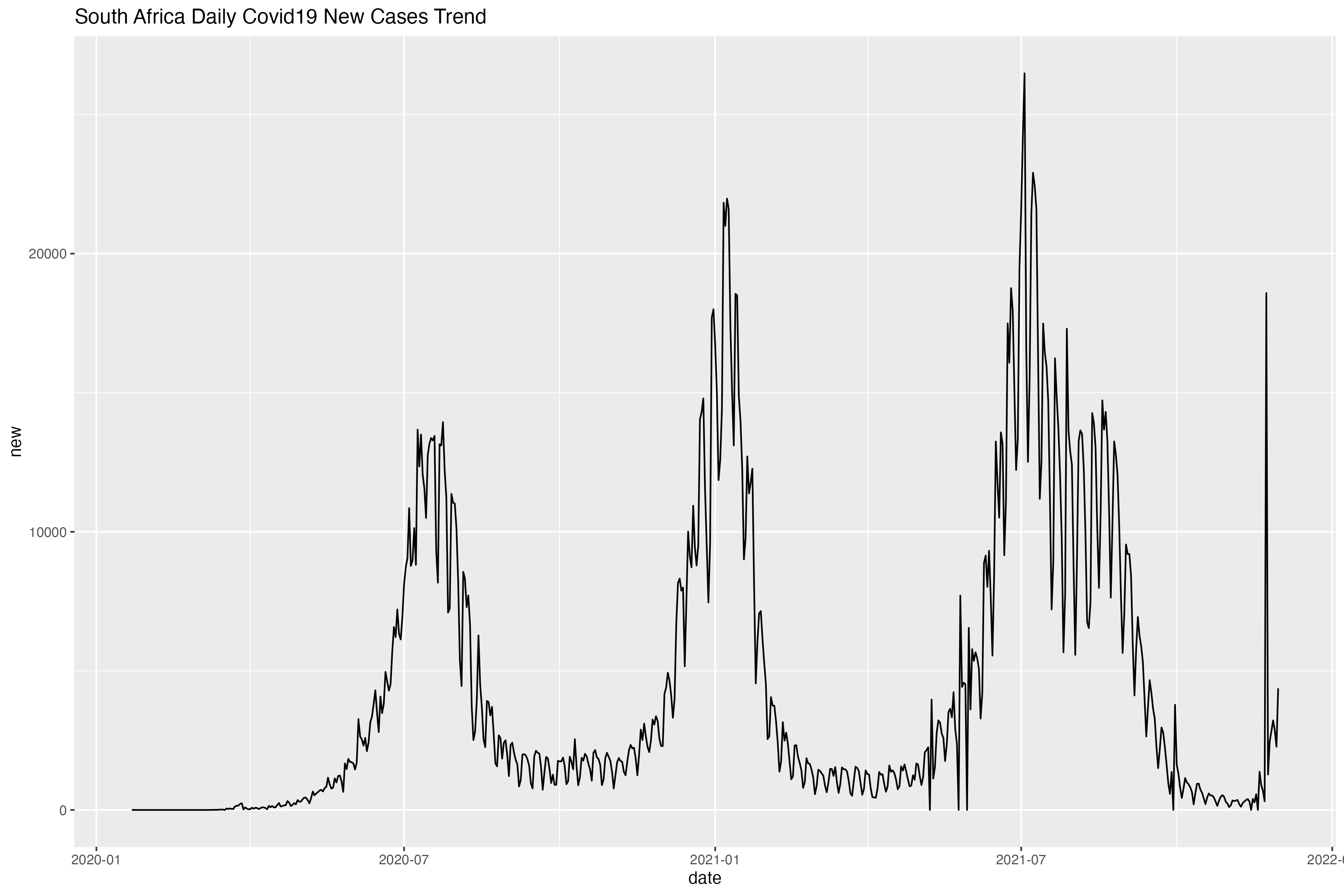ggplot(y, aes(date, new)) + geom_line() + ggtitle("South Africa Daily Covid19 New Cases Trend")