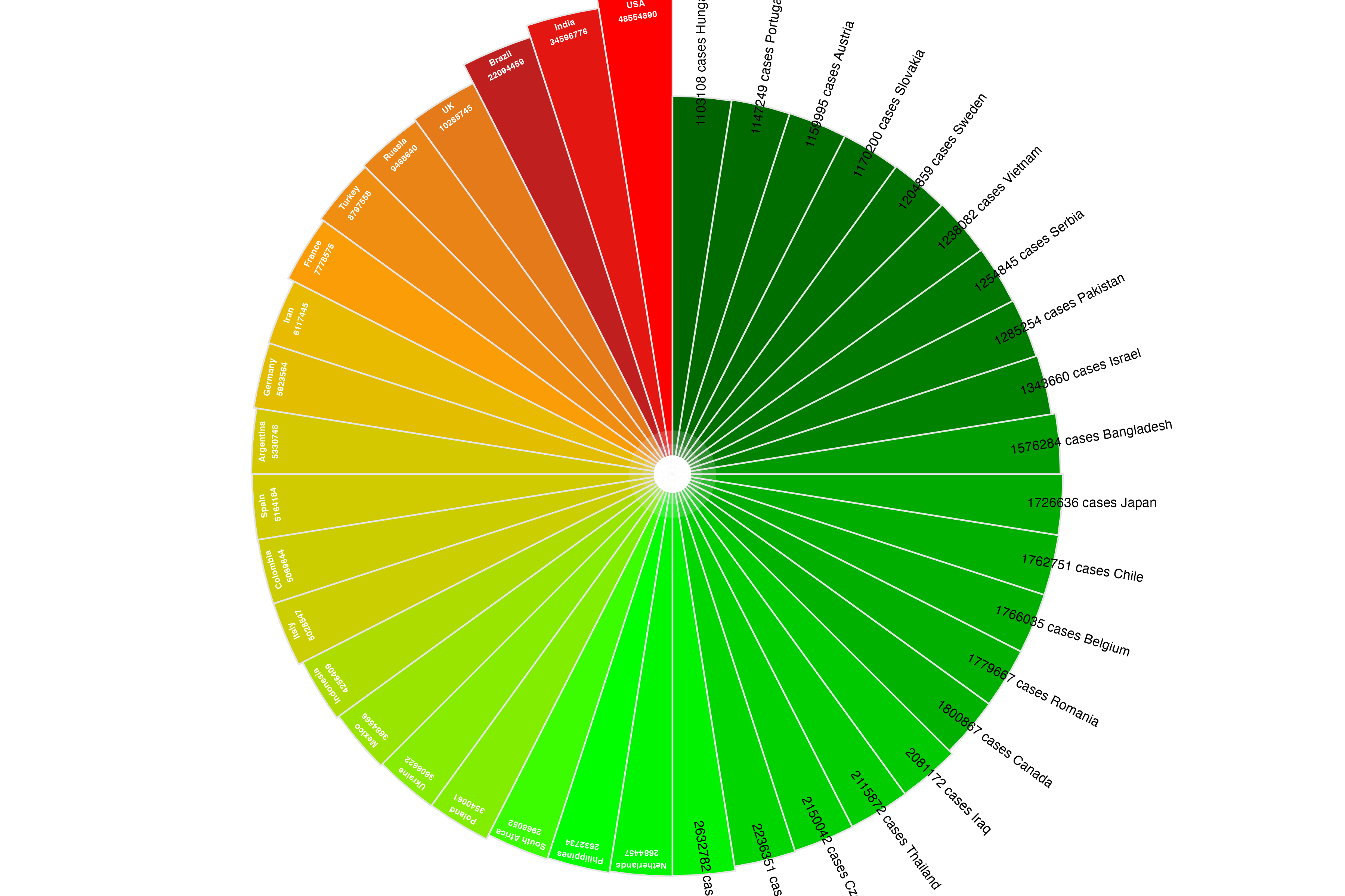 p <- ggplot(dd, aes(country, cases, fill=cases)) + geom_col(width=1, color='grey90') + geom_col(aes(y=I(5)), width=1, fill='grey90', alpha = .2) + geom_col(aes(y=I(3)), width=1, fill='grey90', alpha = .2) + geom_col(aes(y=I(2)), width=1, fill = "white") + scale_y_log10() + scale_fill_gradientn(colors=c("darkgreen", "green", "orange", "firebrick","red"), trans="log") + geom_text(aes(label=paste(country, cases, sep="\n"), y = cases *.8, angle=angle), data=function(d) d[d$cases > k,], size=2, color = "white", fontface="bold", vjust=1) + geom_text(aes(label=paste0(cases, " cases ", country), y = max(cases) * 2, angle=angle+90), data=function(d) d[d$cases < k,], size=3, vjust=0) + coord_polar(direction=-1) + theme_void() + theme(legend.position="none") + ggtitle("COVID19 global trend", time)