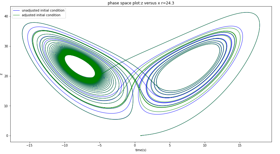 1.发现实际进入混沌的“混沌临界点”并不是计算所得值(r=23.85)而是在r为24到24.3之间(同样的初始条件及其变化量),这是因为前面计算李雅普诺夫指数的方法只是估计值而并未解析的计算(见附录)