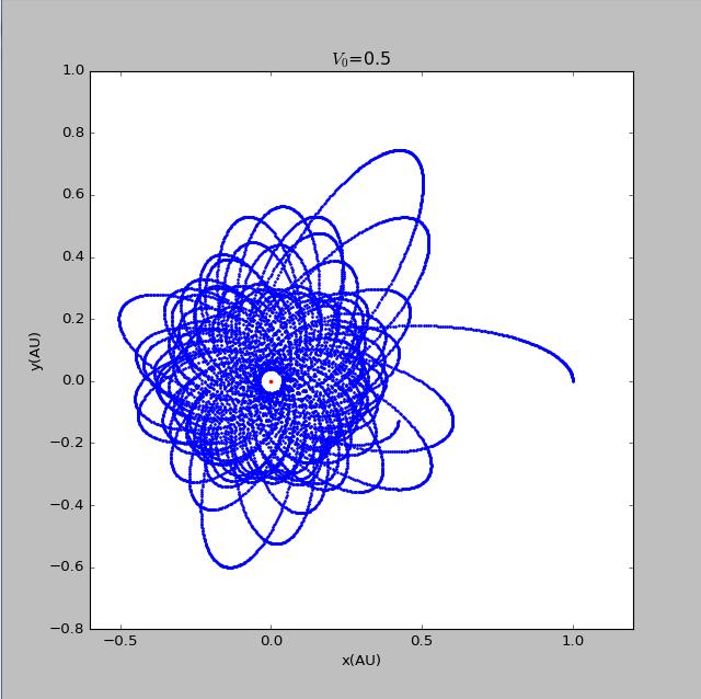当初速度等于0.5时,行星向恒星接近,之后的轨道比较紊乱,但能看出存在进动。