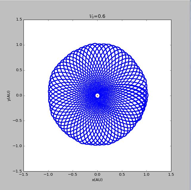 当初速度等于0.6时,行星运动的轨道就显得平稳了,很容易看出存在进动。