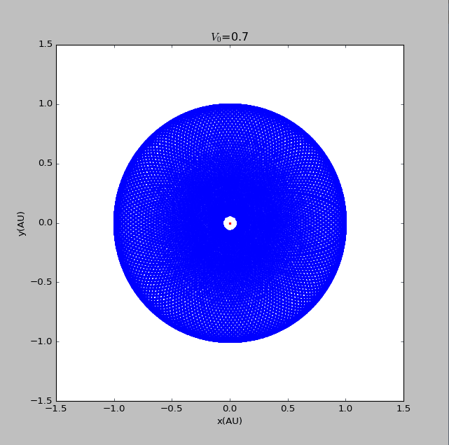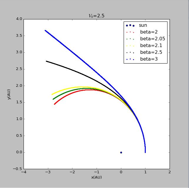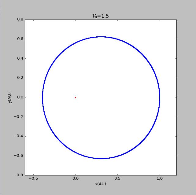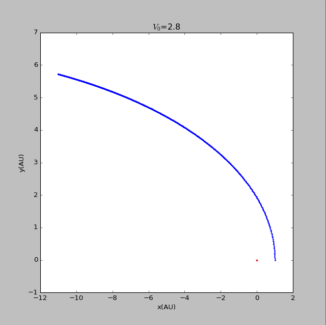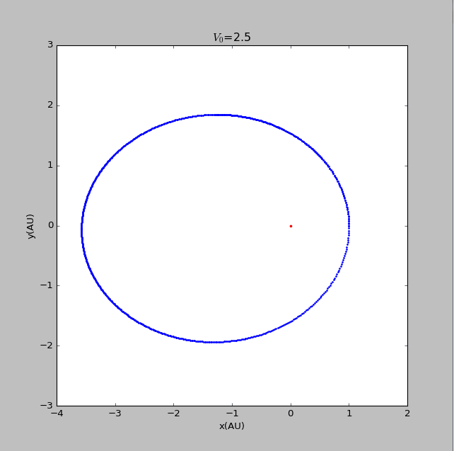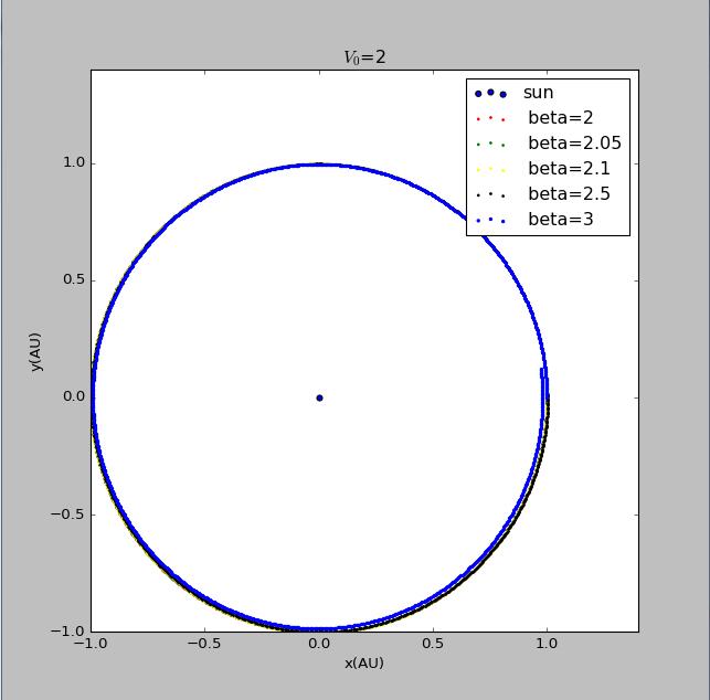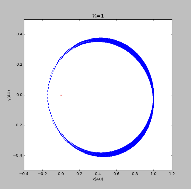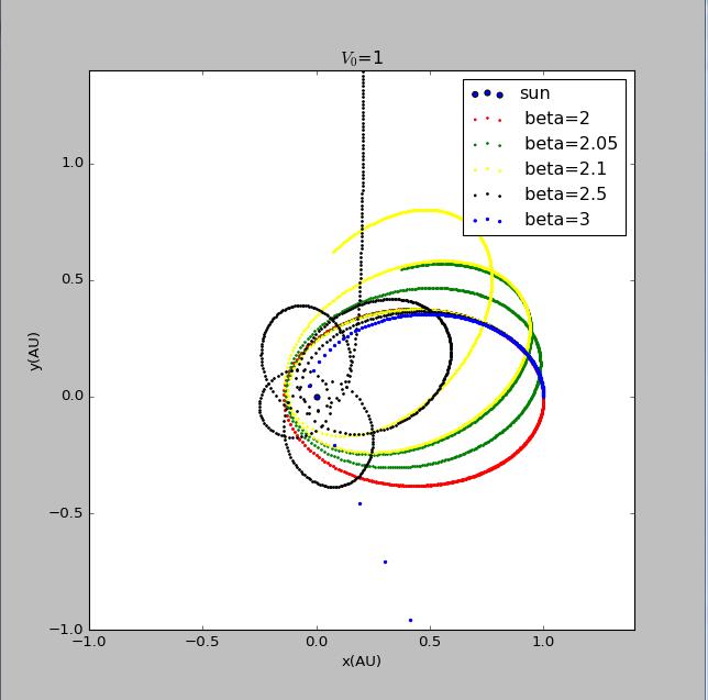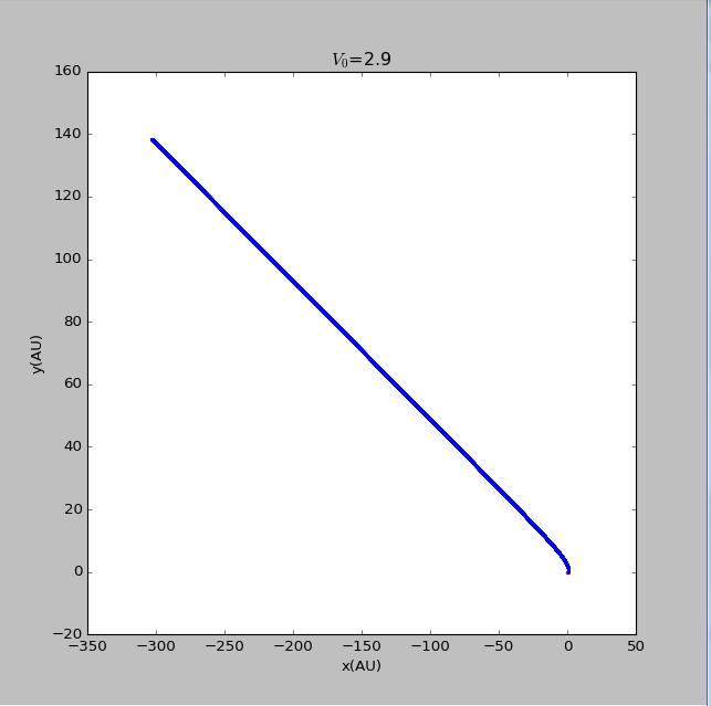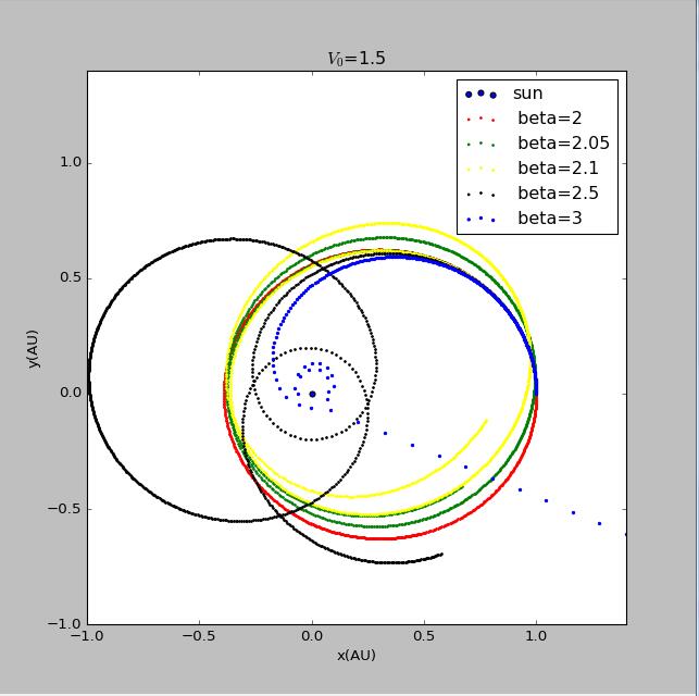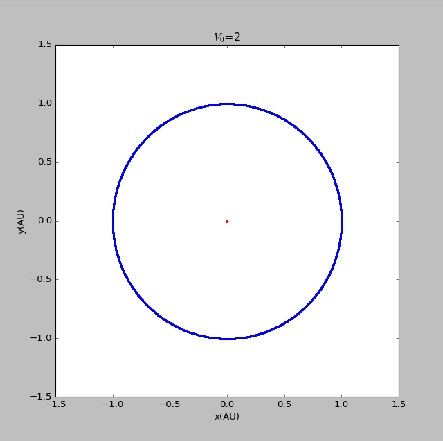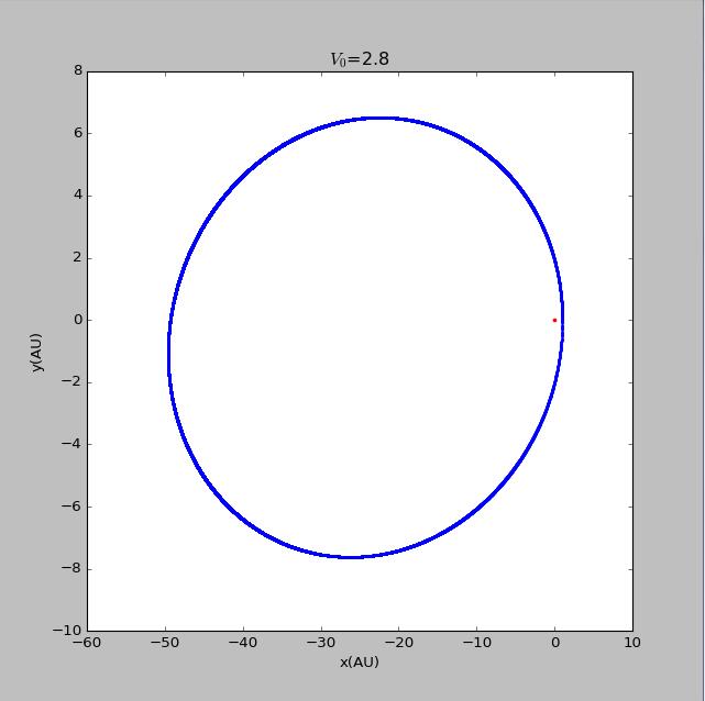 import matplotlib.pyplotimport mathvy0=float(input('please input the initial velocity of the planet :'))x1=[0]y1=[0]def circle(q):x2=[1]y2=[0]vx2=[0]vy2=[vy0*math.pi]t=[0]dt=0.005GM=4*math.pi*math.piwhile t[-1]<150:r=math.sqrt((x1[-1]-x2[-1])**2+(y1[-1]-y2[-1])**2)ox2=-GM*(x2[-1]-x1[-1])/(r**(q+1))oy2=-GM*(y2[-1]-y1[-1])/(r**(q+1))vx2.append(vx2[-1]+ox2*dt)vy2.append(vy2[-1]+oy2*dt)x2.append(x2[-1]+vx2[-1]*dt)y2.append(y2[-1]+vy2[-1]*dt)t.append(t[-1]+dt)return x2,y2x21=circle(2)[0]y21=circle(2)[1]fig=matplotlib.pyplot.figure(figsize=[8,8])matplotlib.pyplot.scatter(x1,y1,label='sun',s=5,color='red')matplotlib.pyplot.scatter(x21,y21,label=' beta=2',s=2,color='blue')matplotlib.pyplot.xlabel('x(AU)')matplotlib.pyplot.ylabel('y(AU)')matplotlib.pyplot.title('$V_0$=2.9')matplotlib.pyplot.show()