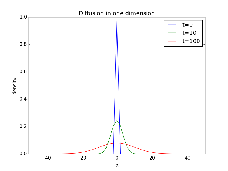 import numpy as npimport matplotlib.pyplot as pltfrom copy import deepcopydef density(t_end):x = list(np.linspace(-50,50,101))d = list(np.zeros(50)) + list(np.ones(1)) + list(np.zeros(50))d1 = deepcopy(d)for i in range(t_end):for j in range(101):if j==0 or j==100:passelse:d[j] = 0.5* (d1[j+1] + d1[j-1])d1 = deepcopy(d)for i in range(101):if i==0 or i==100:passelse:if d[i]==0:d[i] = 0.5*(d1[i+1] + d1[i-1])return x, dx1, d1 = density(0)[0], density(0)[1]x2, d2 = density(10)[0], density(10)[1]x3, d3 = density(100)[0], density(100)[1]plt.plot(x1,d1,label='t=0')plt.plot(x2,d2,label='t=10')plt.plot(x3,d3,label='t=100')plt.xlabel('x')plt.ylabel('density')plt.title('Diffusion in one dimension')plt.xlim(-50,50)plt.legend()plt.show()