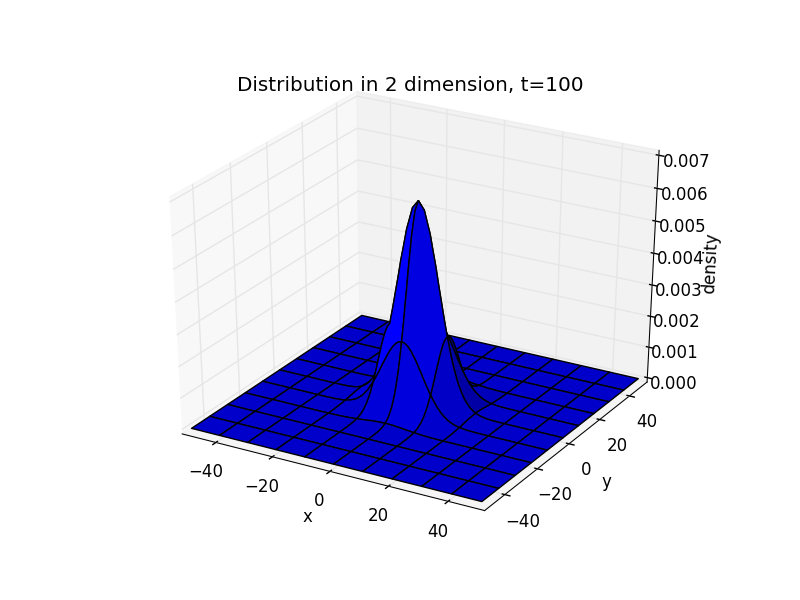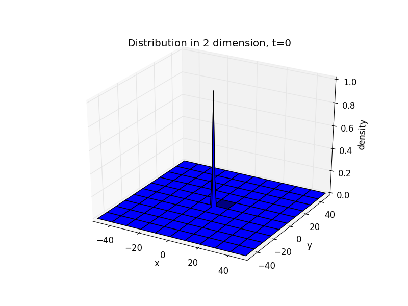 import numpy as npimport matplotlib.pyplot as pltfrom copy import deepcopyimport matplotlib.cm as cmfrom mpl_toolkits.mplot3d import Axes3Ddef density(t_end):x = np.linspace(-50,50,101)y = np.linspace(-50,50,101)x,y = np.meshgrid(x,y)d = np.zeros((101,101))d[50][50]=1d1 = deepcopy(d)for t in range(t_end):for i in range(101):for j in range(101):if i==0 or i==100 or j==0 or j==100:passelse:d[i][j]=0.25*(d1[i+1][j] + d1[i-1][j] + d1[i][j+1] + d1[i][j-1])d1=deepcopy(d)for i in range(101):for j in range(101):if i==0 or i==100 or j==0 or j==100:passelse:if d[i][j]==0:d[i][j]=0.25*(d1[i+1][j] + d1[i-1][j] + d1[i][j+1] + d1[i][j-1])return x,y,dx,y,z = density(100)[0],density(100)[1],density(100)[2]fig = plt.figure()ax = fig.add_subplot(111, projection='3d')ax.plot_surface(x, y, z)ax.set_xlabel('x')ax.set_ylabel('y')ax.set_zlabel('density')ax.set_title('Distribution in 2 dimension, t=100')plt.xlim(-50,50)plt.ylim(-50,50)plt.show()