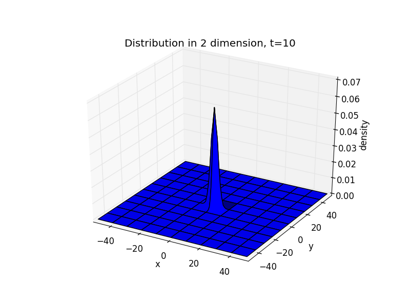 注意这里三张图的z轴范围不同。可见,二维情况下结论与一维时是一致的。而这种行为符合我们对一个扩散过程的直观感受,即在初始时刻在某点滴入一定的扩散物,之后扩散物以该点为中心向四方扩散,直到各处的密度相同。