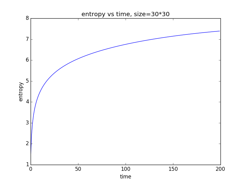 这里我们考虑在一个二维体系中熵是如何变化的。我们考察仅存在单个粒子时的情况。当二维系统为长为30的点阵时,熵与时间的关系为: