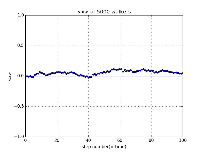 from __future__ import divisionimport numpy as npimport matplotlib.pyplot as pltsteps = np.linspace(0, 100, 101)x_ave = np.zeros(101)x_y0 = np.zeros(101)x_now = np.zeros(5000)for i in range(100):for j in range(5000):ruler = np.random.rand()if ruler<=0.5:x_now[j] = x_now[j] + 1else:x_now[j] = x_now[j] - 1average = sum(x_now)/5000x_ave[i+1] = averageplt.scatter(steps, x_ave)plt.plot(steps, x_y0)plt.xlim(0,100)plt.ylim(-1,1)plt.grid(True)plt.xlabel('step number(= time)')plt.ylabel('<x>')plt.title('<x> of 5000 walkers')plt.show()