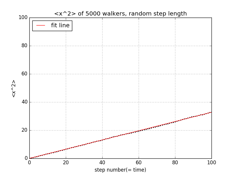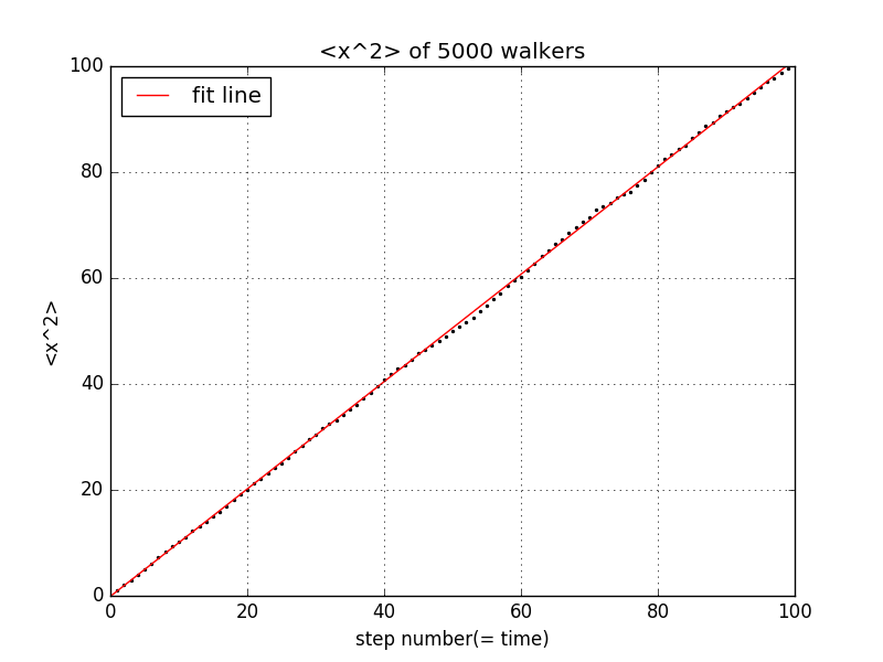 from __future__ import divisionimport numpy as npimport matplotlib.pyplot as pltsteps = np.linspace(0, 100, 101)x2_ave = np.zeros(101)x_y0 = np.zeros(101)x_now = np.zeros(5000)x2_now = np.zeros(5000)for i in range(100):for j in range(5000):length = 2*np.random.rand() - 1x_now[j] = x_now[j] + lengthx2_now[j] = x_now[j]**2average2 = sum(x2_now)/5000x2_ave[i+1] = average2para = np.polyfit(steps, x2_ave,1)poly = np.poly1d(para)y_fit = poly(steps)plt.scatter(steps, x2_ave,s=2)plt.plot(steps, y_fit, 'r', label = 'fit line')plt.legend(loc='upper left')plt.xlim(0,100)plt.ylim(0,100)plt.grid(True)plt.xlabel('step number(= time)')plt.ylabel('<x^2>')plt.title('<x^2> of 5000 walkers, random step length')plt.show()