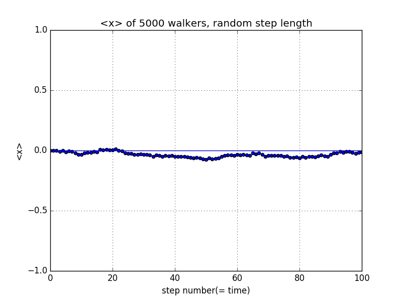from __future__ import divisionimport numpy as npimport matplotlib.pyplot as pltsteps = np.linspace(0, 100, 101)x_ave = np.zeros(101)x_y0 = np.zeros(101)x_now = np.zeros(5000)for i in range(100):for j in range(5000):length = 2*np.random.rand() - 1x_now[j] = x_now[j] + lengthaverage = sum(x_now)/5000x_ave[i+1] = averageplt.scatter(steps, x_ave)plt.plot(steps, x_y0)plt.xlim(0,100)plt.ylim(-1,1)plt.grid(True)plt.xlabel('step number(= time)')plt.ylabel('<x>')plt.title('<x> of 5000 walkers, random step length')plt.show()