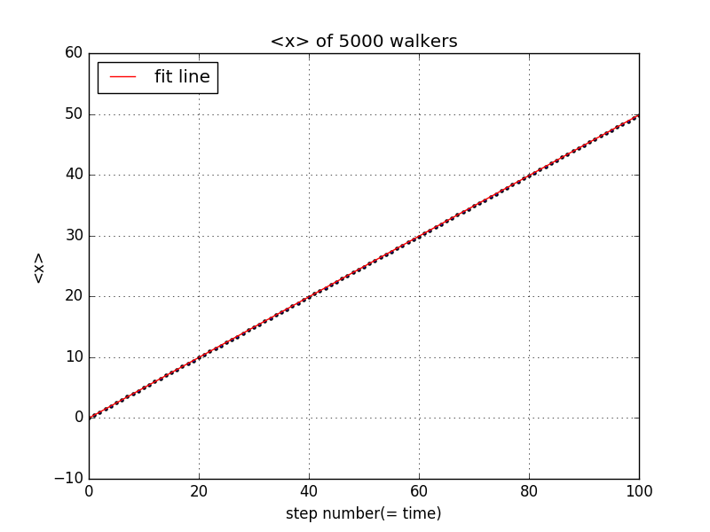 from __future__ import divisionimport numpy as npimport matplotlib.pyplot as pltsteps = np.linspace(0, 100, 101)x_ave = np.zeros(101)x_now = np.zeros(5000)for i in range(100):for j in range(5000):ruler = np.random.rand()if ruler<=0.75:x_now[j] = x_now[j] + 1else:x_now[j] = x_now[j] - 1average = sum(x_now)/5000x_ave[i+1] = averagepara = np.polyfit(steps, x_ave,1)poly = np.poly1d(para)y_fit = poly(steps)plt.scatter(steps, x_ave, s=5)plt.plot(steps, y_fit, 'r', label = 'fit line')plt.legend(loc='upper left')plt.xlim(0,100)plt.grid(True)plt.xlabel('step number(= time)')plt.ylabel('<x>')plt.title('<x> of 5000 walkers')plt.show()