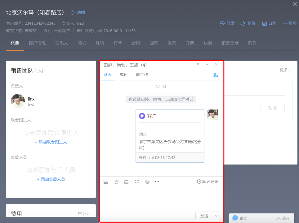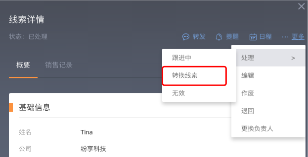 发送销售记录、转发、提醒、日程、电话、邮件、更多;