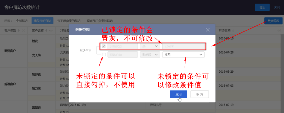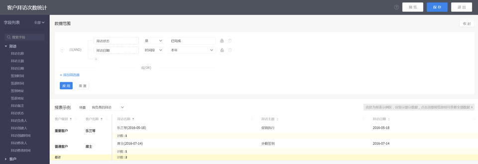 员工姓名、拜访状态、客户名称字段做【分组】。拜访名称字段做【统计-计数】。拜访日期 为 本月。常用变化1:仅显示已完成的拜访。