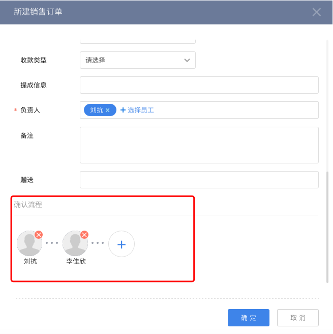 新建订单页面下方可选择订单确认流程,初始默认为订单管理员,可选择的角色有:订单管理员、财务人员和同事。