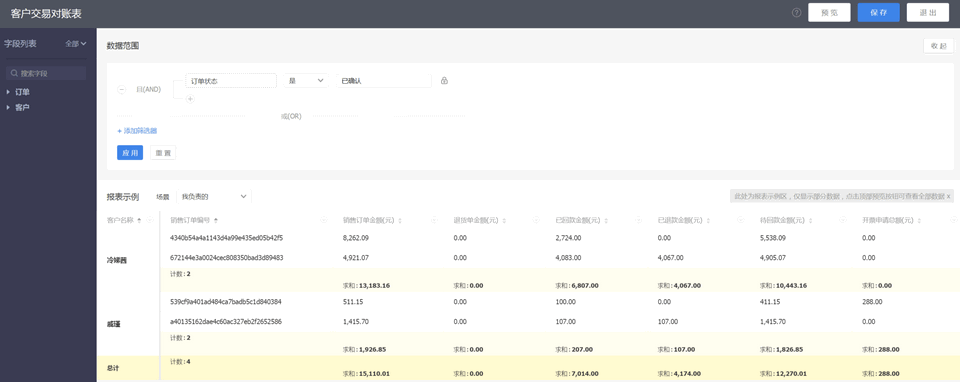 员工姓名、客户名称字段做【分组】。订单编号字段做【统计-计数】,对销售订单金额(元)、退货单金额(元)、已回款金额(元)、已退款金额(元)、待回款金额(元)、开票申请金额(元)字段做【统计-求和】。订单状态 是 已确认。常用变化1:不仅统计已确认的订单,统计所有订单。