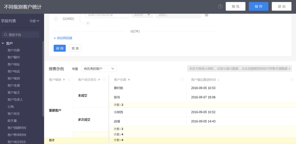 1.根据新建报表时选择的模板不同,左侧的报表可用字段不同,默认的筛选场景也不同。