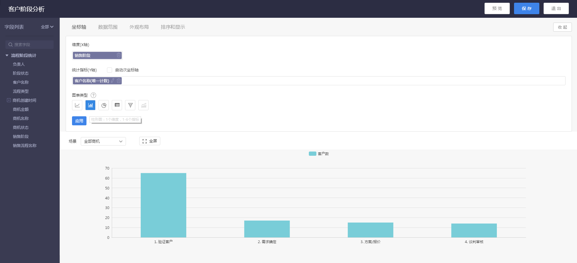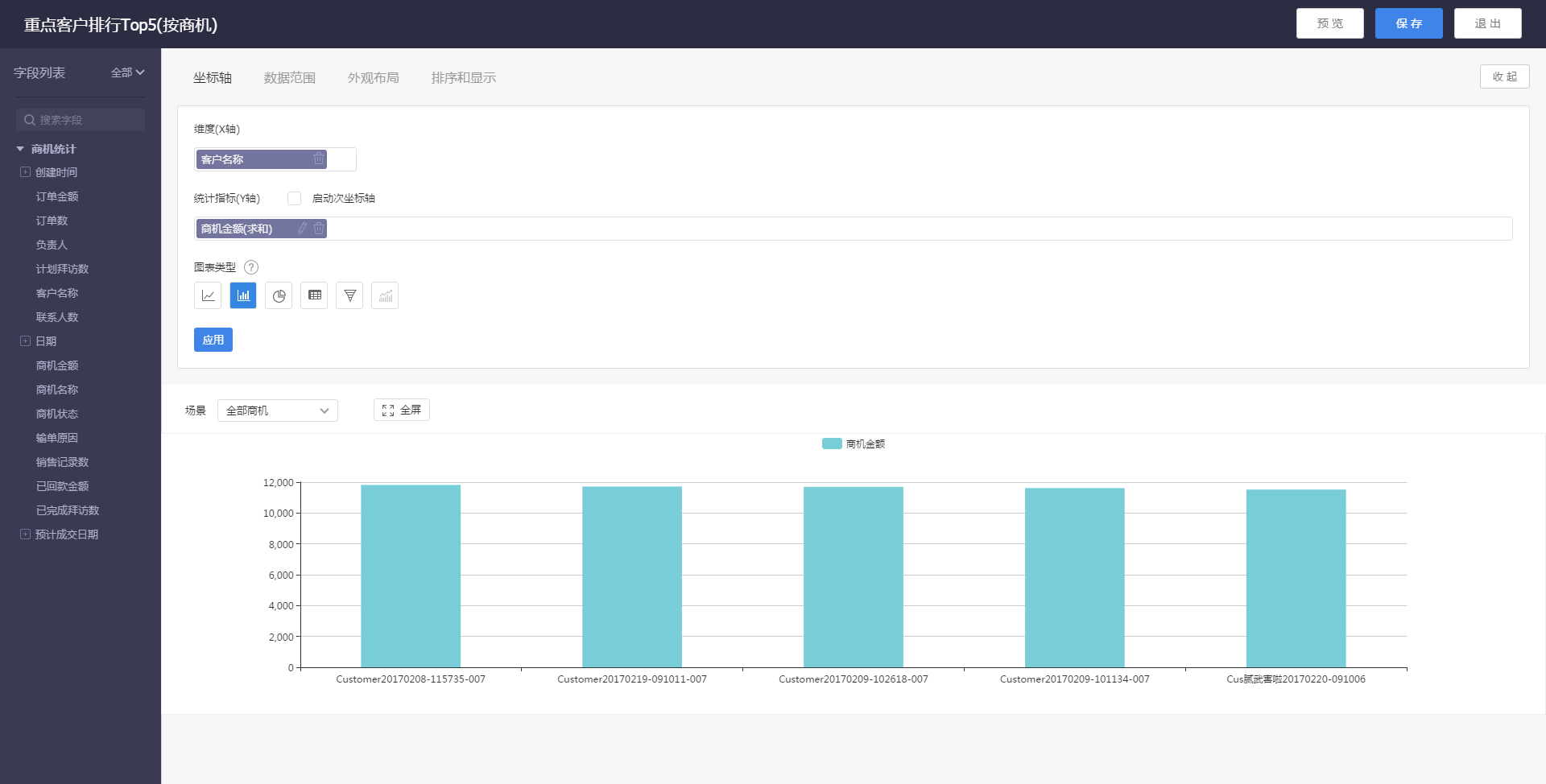 注意:统计图可用字段,包含了该对象本身的一些属性和与该对象关联对象的一些特征值。以客户主题为例,客户本身的属性包括客户名称、客户状态、所属行业、所属公海、负责人等,特征值是与客户产生关联的商机、拜访、订单等对象产生的相关情况,比如客户关联的商机个数、商机金额等。