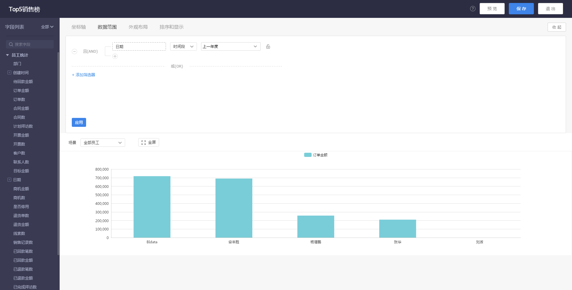 统计图的每个主题都是由一个CRM对象本身的一些属性和与该对象关联对象的一些特征值的字段组成的集合。以客户主题为例,客户的属性包括客户名称、客户状态、所属行业、所属公海、负责人等,特征值是与客户产生关联的商机、拜访、订单等对象产生的相关情况,比如客户关联的商机个数、商机金额等。