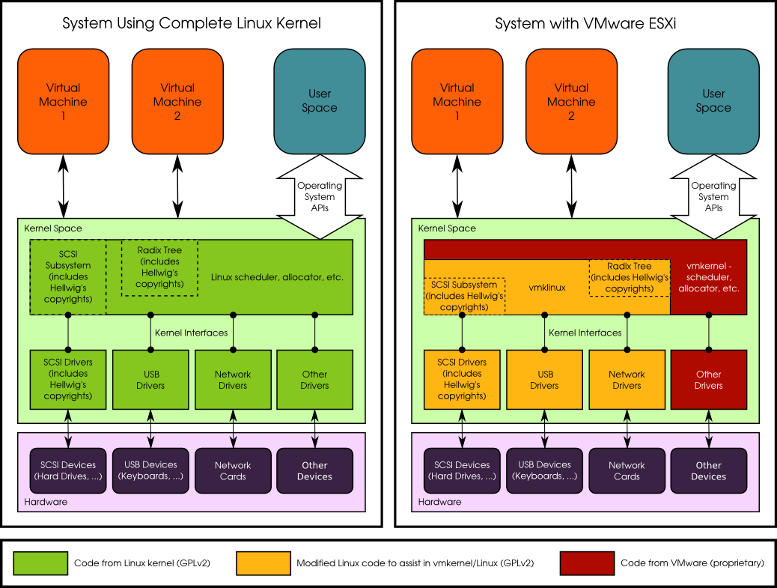 VMware被指在他们的ESXi产品中使用了Linux内核相关的代码而没有遵守GPLv2。虽然VMware大量使用开源软件,但ESXi不是一个纯粹的开源产品,它也包含了一个“私有”组件叫做vmkernel。系统会先启动一个Linux,由Linux加载一个叫“vmklinux”的模块,再由这个模块加载vmkernel代码,而VMware就是在vmkernel中实现其hypervisor功能的。根据这样的关系,vmkernel被认定为是一个“加载到内核空间并运行”的模块,根据GPLv2,vmkernel必须也要通过GPLv2授权。但这还不算完,开放的vmklinux的代码中有很多从Linux移植过来的代码,其中包括Hellwig拥有版权的SCSI子系统和基数树(Radix Tree)算法的实现。Hellwig认为vmkernel为了支持这些从Linux