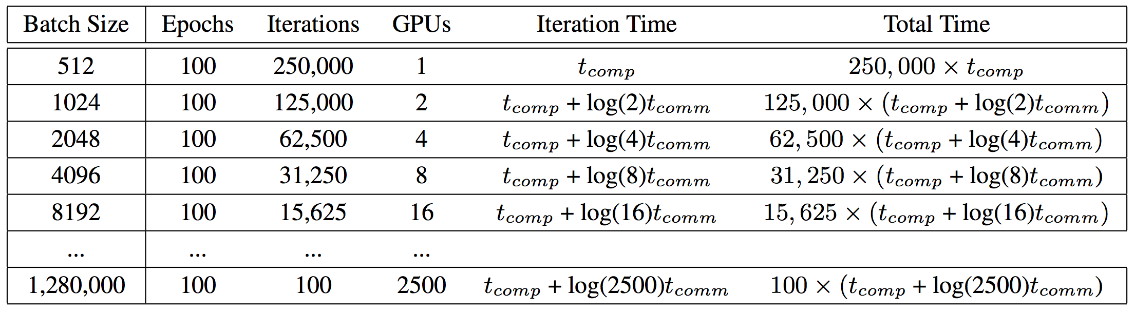 在理想情况下,如果我们固定数据整体访问量并根据处理器数量线性增加batch size,每次迭代的batch size越大,所需要的迭代次数就越少。在增大batch size的同时,我们可以使用更多处理器以保持单循环时间基本维持恒定。如此一来,我们就可以获得线性加速比(如表1所示)。