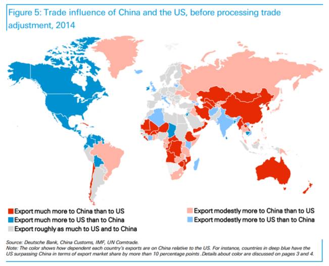 2014年数据显示,中国进口占全球出口商品的10%,为第二大出口市场。如下图所示,中国已经成为亚洲、中东、非洲大部分国家的出口市场。很多欧洲国家对中国出口和美国出口比重相差无几。美国在南美洲的出口市场地位也正受到中国挑战。(红色表示该市场更依赖中国,蓝色表示该市场更依赖美国。)
