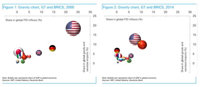**2015年后,世界已经进入双核模式。**2014年,中国对全球GDP贡献率达到13.5%(美国:22.5%),进口占全球出口量10%(美:12.5%),FDIs占比10.5%(美:7.5%)。