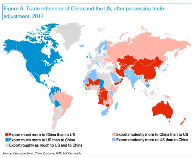 根据“再出口”调整,德银得出了一张更为准确的需求表,数据显示,中国在中亚、大洋洲、非洲大部分地区和中东、巴西、智利、俄罗斯依然保持优势,但东亚和东南亚地区对中国市场的出口需求,与传统统计方式相比产生明显变化。