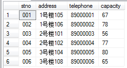 insert into inventory.dbo.store(stno,address,telephone,capacity)values('001','1号楼105','89000001',67)insert into inventory.dbo.store(stno,address,telephone,capacity)values('002','1号楼106','89000002',78)insert into inventory.dbo.store(stno,address,telephone,capacity)values('003','2号楼101','89000003',56)insert into inventory.dbo.store(stno,address,telephone,capacity)values('004','2号楼102','89000004',77)insert into inventory.dbo.store(stno,address,telephone,capacity)values('005','3号楼104','89000005',80)insert into inventory.dbo.store(stno,address,telephone,capacity)values('006','3号楼108','89000006',65)