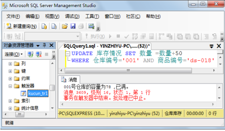 Create trigger zhou_trl ON inventFOR insert,updateASDeclare @s int,@s1 int,@NO char(3)select @S=SUM(invent.number) from invent,insertedwhere invent.stno=inserted.stnoselect @s1=capacity,@NO=inserted.stno from invent,insertedwhere invent.stno=inserted.stnoif @S>@S1BEGINPRINT @NO+'号仓库的容量为'+CAST(@s1 as char(3))+',已满。'ROLLBACKEND