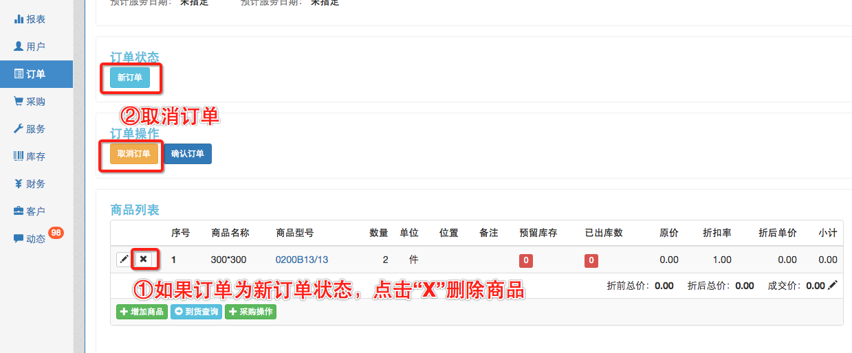订单如果在新订单的状态,把所有商品删掉,点取消定单;如图: