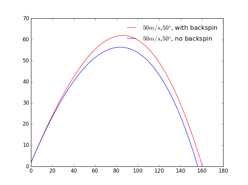 回旋球会使棒球往上飘,相对于无旋球射程变得更远了。可以看出加上回旋后,棒球飞行得更高更远了。可以想象,给棒球加上不同的旋可以打出各式各样的曲线来。