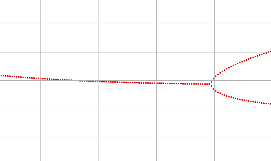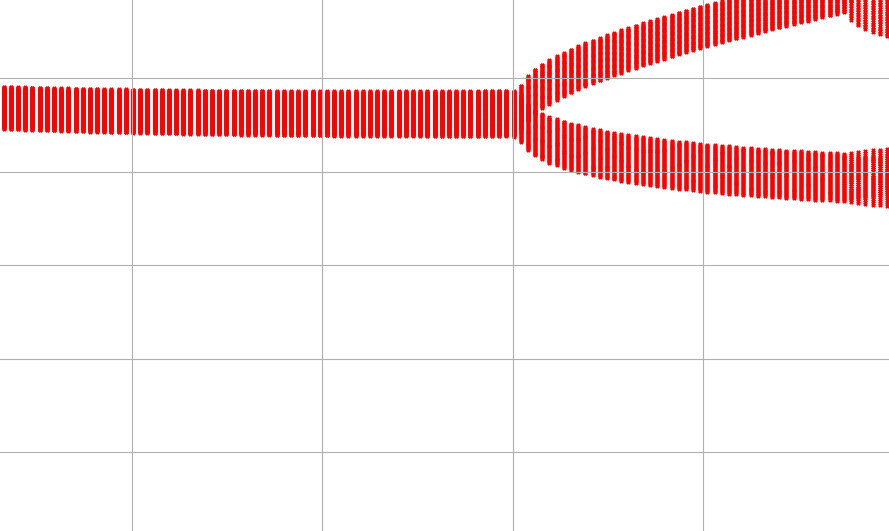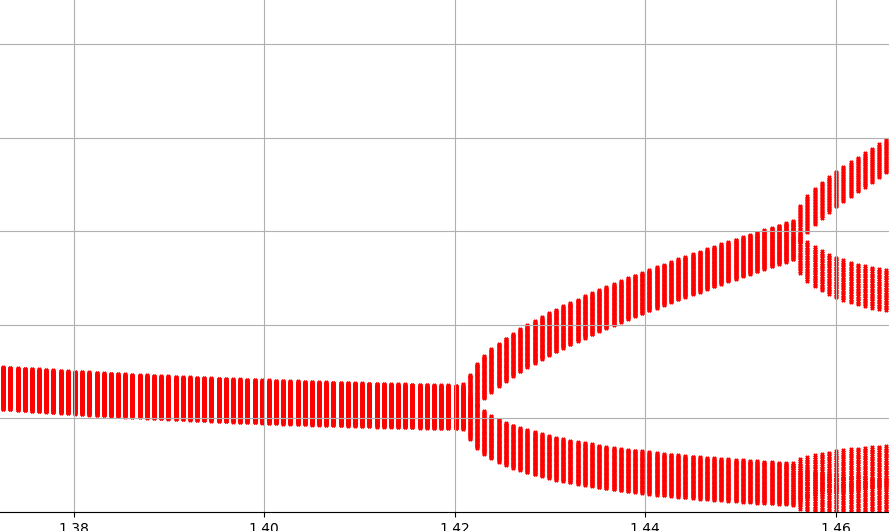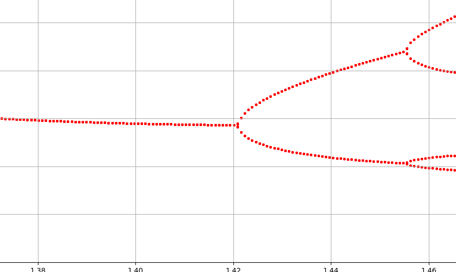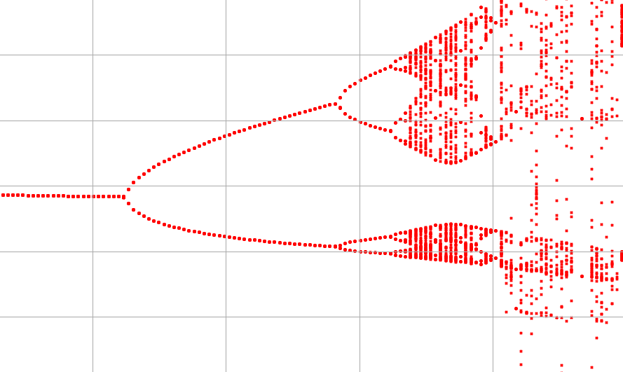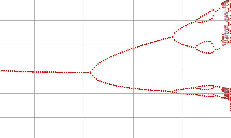 (这里同样有一点奇怪的地方,阻尼继续减小时,图形的轮廓已经完全变化了,可以预测,继续减小,轮廓会继续消失,最终将吞没二倍点)