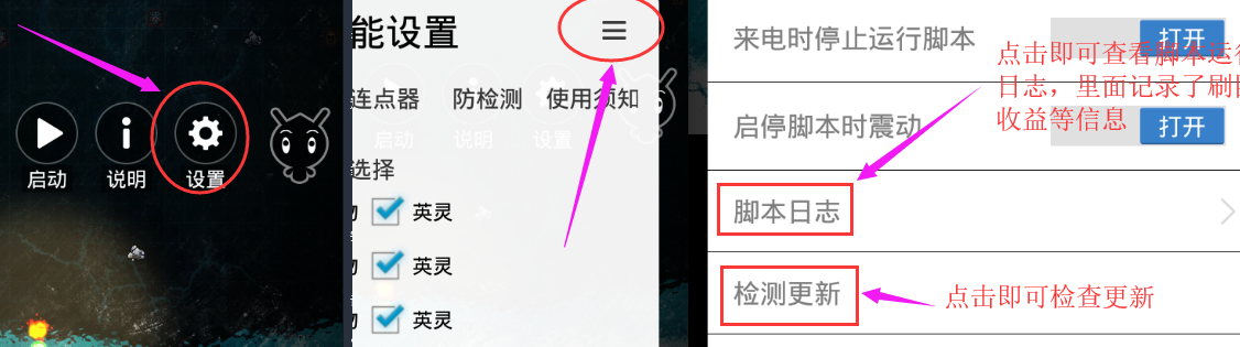 点击辅助悬浮窗>设置>菜单,点击查看日志即可查看脚本运行日志,里面记录了一些脚本运行信息,包括挂机收益以及一些运行异常记录,点击检查更新即可在线更新辅助