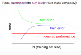 High bias (underfitting): both and will be high. Also, .