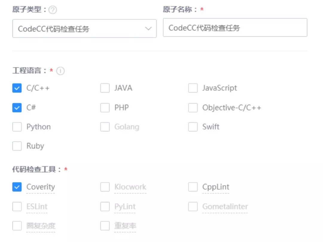 CodeCC 代码检查,提供了专业的代码检查解决方案及服务,它集成了含商用、开源、自研的代码检查工具,包含Coverity、Cpplint、PyLint、TSC-lua、重复率工具、圈复杂度工具、ESLint、Gometalinter。