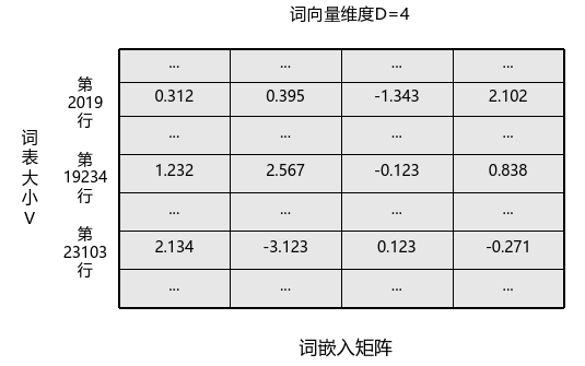 假设语义空间维度为,词表大小为,则全部词向量可以保存在一个的矩阵里,矩阵每一行保存一个词向量,一个词在词表中是第几个,那么它对应的词向量就保存在矩阵的第几行。通过查表操作,就可以很方便的将表示一个词的数字转换为词向量。假设有如下的词嵌入矩阵: