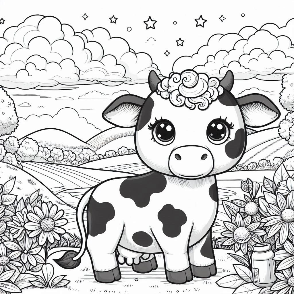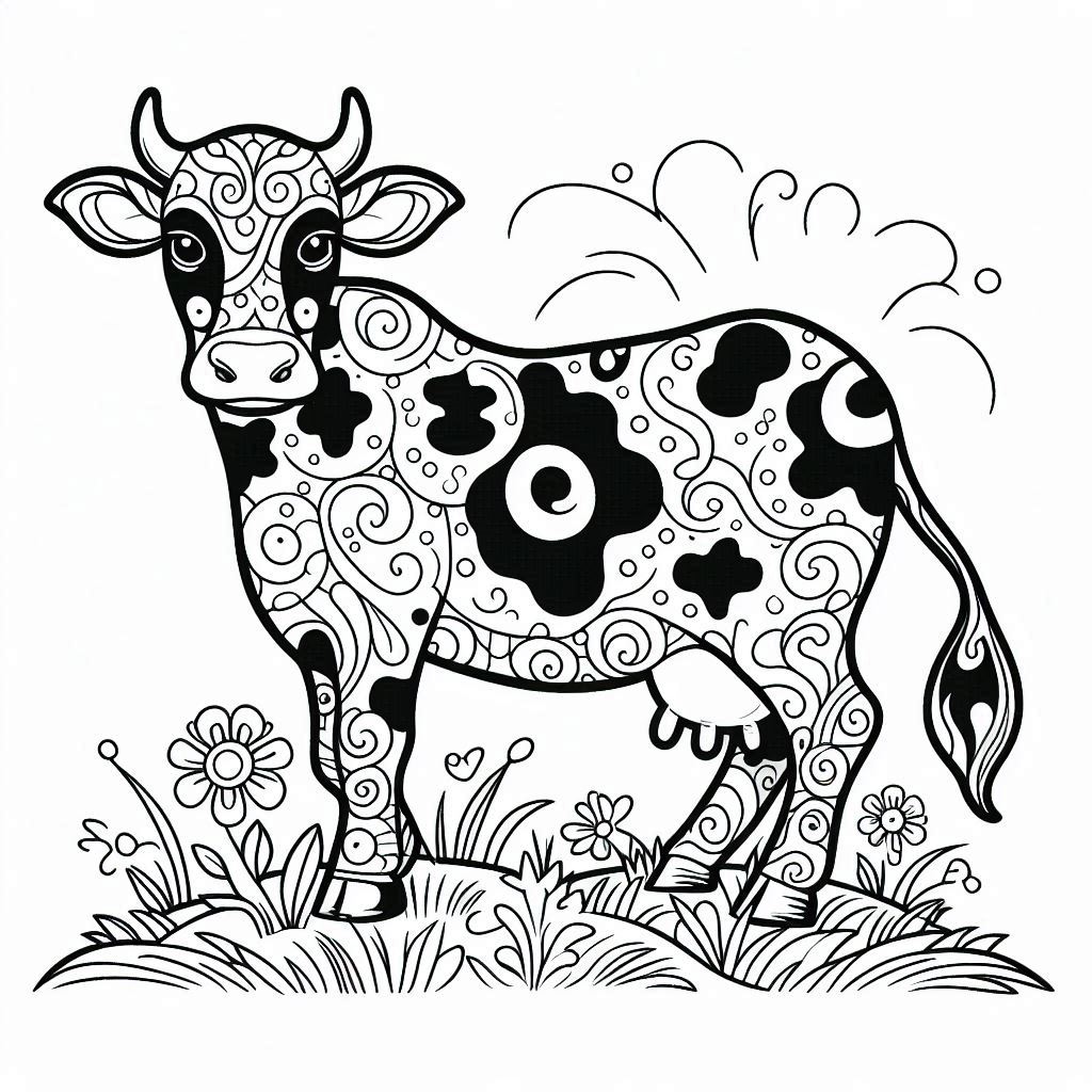 This cow coloring page features a lovely cow standing proudly in a field of flowers. The cow has a unique pattern on its body, filled with swirls and shapes. Children can use bright colors to bring the cow to life. The cow's big eyes shine with joy, and its ears perk up as it enjoys the sunny day. The flowers around the cow add a cheerful touch to the scene. Kids can imagine the cow munching on grass while surrounded by nature. This coloring page inspires creativity and fun as children choose their favorite colors for the cow and the flowers.