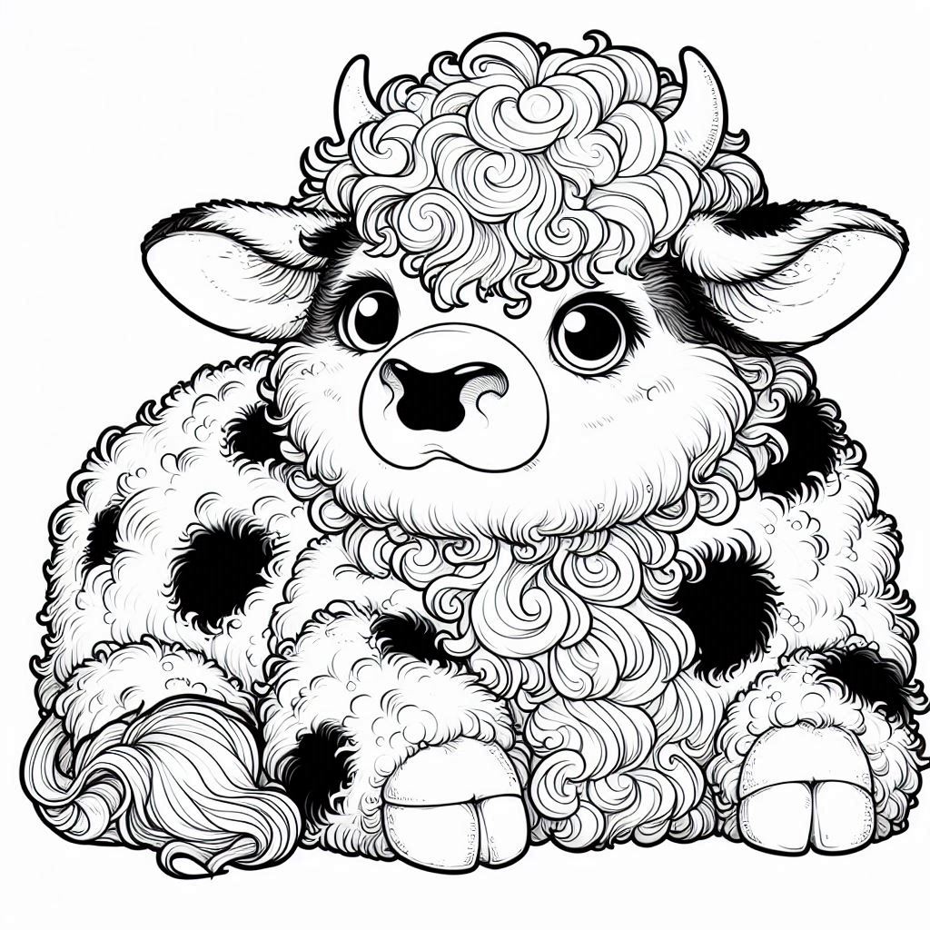 This cow coloring page features a fluffy calf lying down comfortably. The calf has a soft, curly coat, making it look adorable and cozy. Its big eyes are full of wonder, inviting children to color it in bright shades. The calf rests peacefully on the grass, surrounded by nature. Kids can use their favorite colors to create a warm and inviting atmosphere. This page encourages children to relax and enjoy the coloring process while imagining a peaceful farm setting.