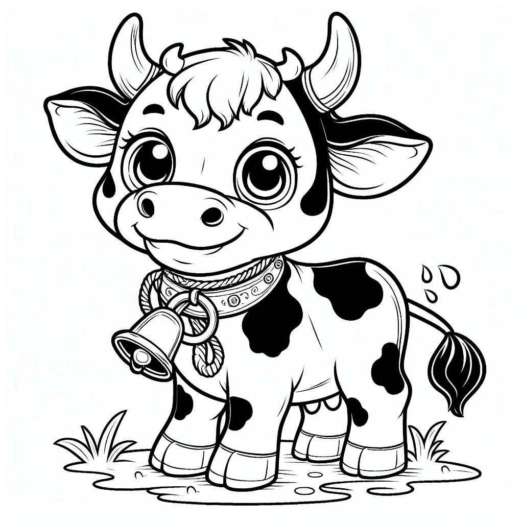 This cow coloring page presents a cheerful cow with a shiny bell around its neck. The cow stands in a grassy area, looking friendly and playful. Its big, round eyes express curiosity and joy. Children can choose colors for the cow's spots and the bell, making it as colorful as they want. The cow's smile adds a sense of happiness to the scene. Kids can imagine the cow roaming freely in the fields, enjoying the fresh air. This coloring page invites children to engage with their artistic side while having fun.