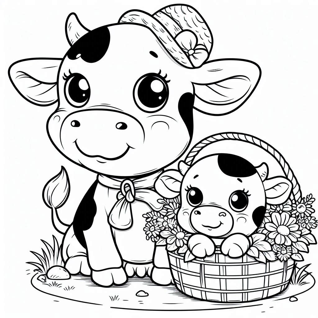 This cow coloring page shows a cute calf wearing a charming hat. The calf smiles warmly at everyone, making it hard not to smile back. Next to the calf, there is a small basket filled with flowers, adding a touch of sweetness to the picture. The calf's big eyes sparkle with happiness, inviting children to fill the page with bright colors. Kids can color the calf in any way they like, using their imagination to create a special look. This page encourages children to explore their creativity while having fun with colors.