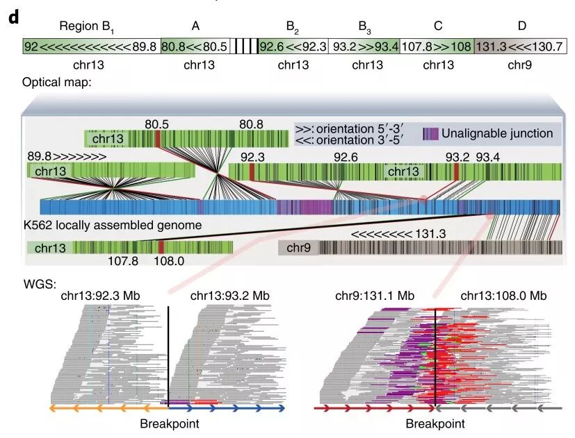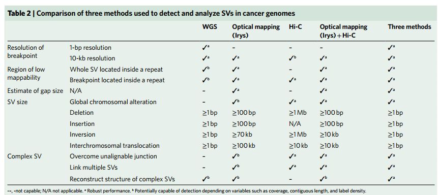 利用七个癌细胞系中产生WGS数据,平均覆盖率>30×,构造了一个内部流程结合了LUMPY, Delly, and Control-FREEC三个软件,用于初始SV检测,然后执行数据过滤;光学图谱,平均覆盖率约为100×。使用RefAligner 6119 (Bionano Genomics) and pipeline 6498进行从头组装和SV检测,并进行进一步数据过滤;最后作者开发了一种使用Hi-C识别重排事件的,包括易位,倒位、缺失和串联复制的算法;经过比较和合并每个测序平台的结果,确定了数千个插入和缺失(>50 bp),数百个串联重复和染色体间易位,数十个倒位。