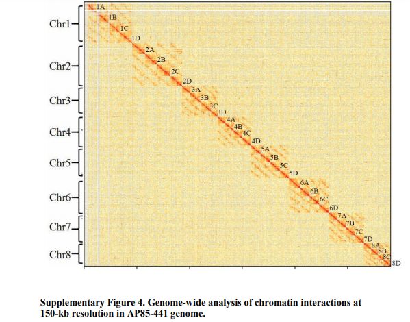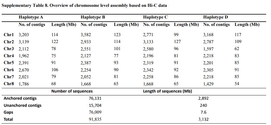 通过比较四个同源染色体A, B, C and D,鉴定了 7.7 million SNPs, 1.03 million short indels and 3,637 SVs。