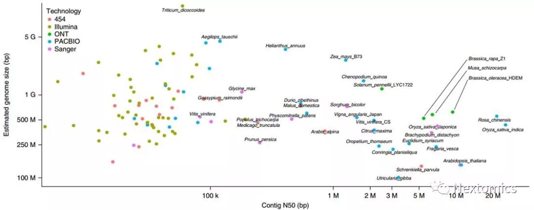 结合ONT MinION/PromethION、Bionano光学图谱和Illumina的测序策略能够为获得高质量、低花费的植物组装提供了心得思路。三代测序变得越来越重要。